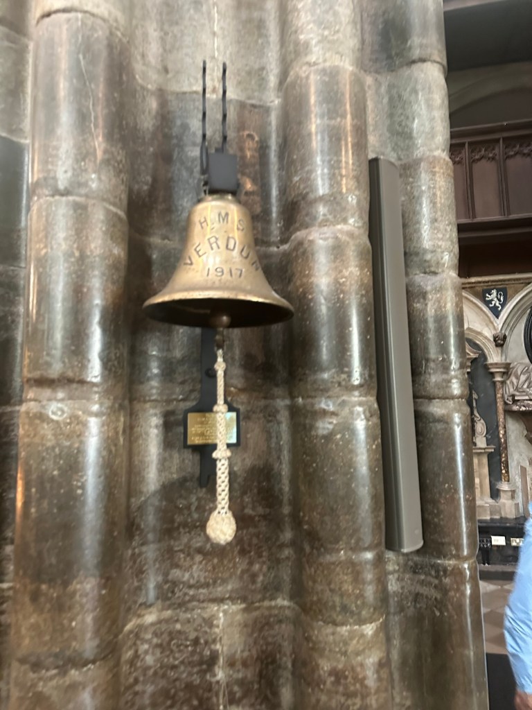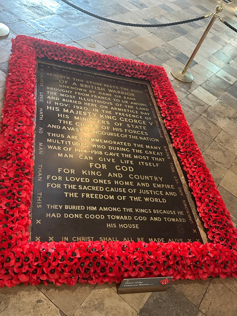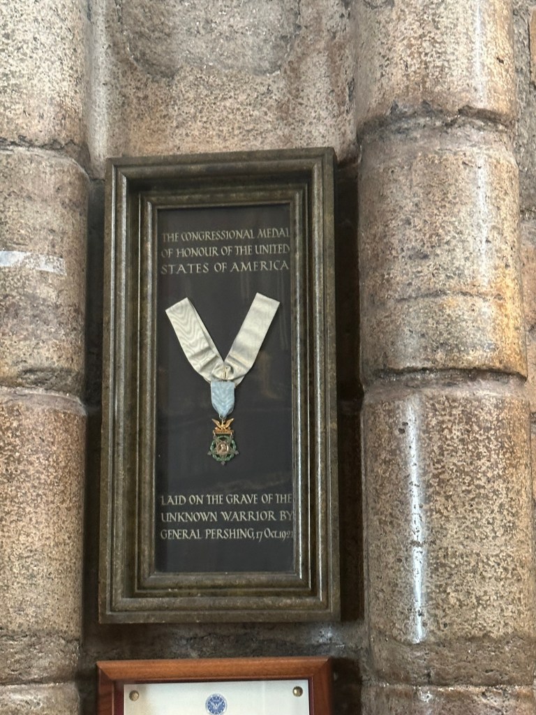 After seeing some sections of the beautiful architecture and learning a lot about the history of the building itself from our tour guide, our group’s first proper stop was at the grave of the Unknown Warrior. As is natural, nothing is directly known about this person. The body itself is that of a British soldier who “fell in the Great War 1914-1918 for King and Country” (per the coffin plate inscription). The memorial itself is representative to the thousands of soldiers who died in war with no grave for their families to mourn at. In general, it represents the sacrifices of every soldier who died and has died in war. The idea itself came from Reverend David Railton who noticed a grave of (by the inscription) “An Unknown British Soldier” in France. He then started the process that ended with an unknown warrior being buried and the memorial being made. Many ceremonies and items have been made or added to commemorate this memorial. The picture above is the bell of H.M.S Verdun which is the ship that brought the body from France. The other is a Congressional Medal of Honor from the United States of America awarded to the warrior on October 17th, 1921. Under that, not visible in the picture, is a flag from the Congressional Medal of Honor Society given in October 2013. Standing in front of this memorial was, in itself, a powerful experience. With all it represents, it was an honor to be in its presence.