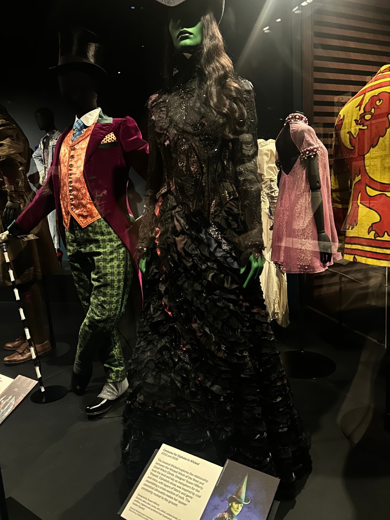 This costume in particular I chose because it is directly related to Wicked (its literally Elphaba’s costume) and I saw Wicked on the 23rd here in London! When Shawn told us this costume was in the exhibit, I almost shed a tear and I knew I had to find it as quickly as I could. When I entered the second room of the exhibit, and saw the black witch hat peeking through the glass, I knew this was about to be a perfect moment!!! There she was in all her glory – the Act 2 Elphaba Dress. Now one of the best and most symbol – ridden parts of Wicked as a whole is the costumes. They are full of nods to the original book, the 1939 movie, and of course rich with character symbols and key characteristics that help the show along in a beautiful way. This dress, along with all of the costumes in Wicked, was designed by Tony Winner Susan Hilferty, who actually won her Tony from her designs in Wicked. They are superb and perfect and I wish I could wear them every day. I literally dream of donning the Glinda Bubble Dress at least once a week.