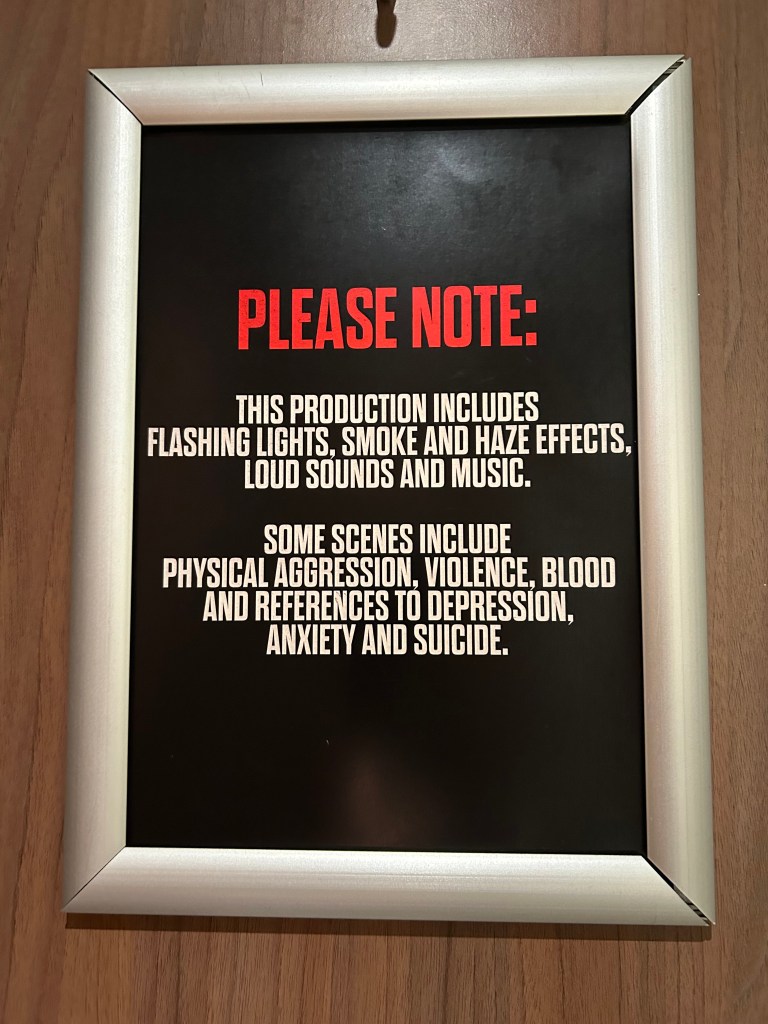 This one is not nearly as long as the previous one but when the lights came back on again I physically jumped in my seat. I thought that the “Walking Dead the Ride” cue line was going to be the scariest experience I would have on this trip, but I was wrong. There, in the center of the stage just as before stands Romeo, but he is no longer Romeo. His face, arms, neck and shirt are drowning in lines and streams of blood. He is still staring intently ahead at the audience, clenching his bloody hands. To his right lies Tybalt; still and unmoving; drowned in his own blood. Romeo looks blankly at his bloody hands. Benvolio cannot believe what he has witnessed and shouts at Romeo to run for his life. This breaks Romeo’s trance and he bolts off stage. Benvolio tries to follow but is stopped by a bright white spotlight and a booming voice coming over the speakers. It is lord Capulet and he demands to know what happened. Benvolio, terrified, describes the situation and how the two dead men met their end. The lights faded to black and I thought it was time for intermission, but all of the sudden the screen lit up with Tom Holland’s bloodied face screaming at the top of his lungs as he continued to run from Verona. Blackout #3.