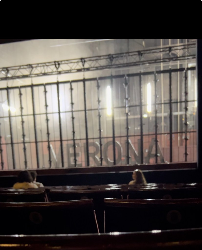 I arrived at the theatre 40 minutes early (of course) and while I was in the loo, the preshow music (if you can call it that) started blaring over the speakers. It was a cacophony of scratchy sounds and EDM music that filled the air with uneasy tension. When I got to my seat I watched the fire curtain rise to reveal a mostly empty stage floor with large bulb-light letters spelling VERONA and a mesh-like, see-through screen in front of them. There were no legs, no borders, no cyc, and no lighting on the stage aside from an occasional row of lighting bars. I could see absolutely everything, from the crew in their positions on the fly rail, to the bricks that made up the actual walls of the theatre itself. This awareness of the stage faded away during the permanence because the stage was completely dark, but everything was visible at the start.