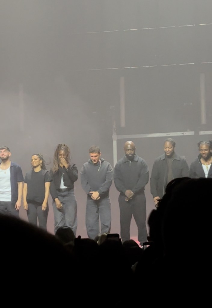 When the show began, the room was plunged into darkness and the screen revealed an extreme close-up of the narrator Michael Balogun who also portrayed Friar as he softly spoke the prologue to the audience. The screen was capturing a live feed of the actor who was standing behind it being filmed on stage by a cameraman. There were several instances of this technique being used and each time it happened I got chills. When the screen started to rise, the video feed cut and the first scene between the Capulet and the Montage began with the two actors whispering into standing mics facing the audience. It looked like a staged reading but it felt like my soul was being held at gunpoint because as they were quietly speaking I could feel the tension in the air. When they said all they needed, the lights went crazy and flashbanged the audience three times as the loudest, most abrasive noises possible emanated from the speakers. I honestly thought I was going to die for a second. When my eyes and ears stopped being harassed, the stage lights came back up, but the actors all exited while a stage manager crossed to center stage and told the audience the show would have to pause for a moment.