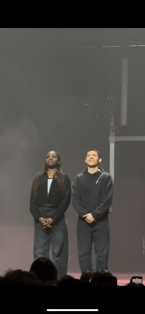 When we are first introduced to Tom- I mean Romeo, he sits on the ledge of the stage and accidentally pushes his hand into a pool of blood. It is my belief that the crazy lighting fight at the start of the play represented a real battle between a Captulet and a Montague that ended in bloodshed. Romeo contemplates this with Mercutio as he sees his blood-stained hand. Then we finally get to the party scene and meet the wonderful Francesca Amewudah-Rivers as Juliet! Every actor is wearing black athletic clothes, but I noticed that the higher classes were wearing higher-end athletic clothes such as Juliet in a nice adidas jacket and black pumps while the nurse wore a black tee shirt and leggings. Also, When Romeo and Juliet meet they reveal white shirts underneath their black jackets. After the balcony scene, Romeo takes his black jacket completely off and reveals Tom Holland’s absolutely toned muscles, but I digress.